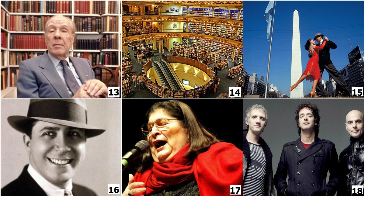 13. Jorge Luis Borges, một trong những nhà văn tiêu biểu của nền văn học Argentina. 14. Nhà sách El Ateneo tại Buenos Aires. 15. Cặp vũ công tango, trình diễn trước biểu tượng Obelisco. 16. Carlos Gardel, ông hoàng nhạc Tango. 17. Mercedes Sosa. 18. Soda Stereo.