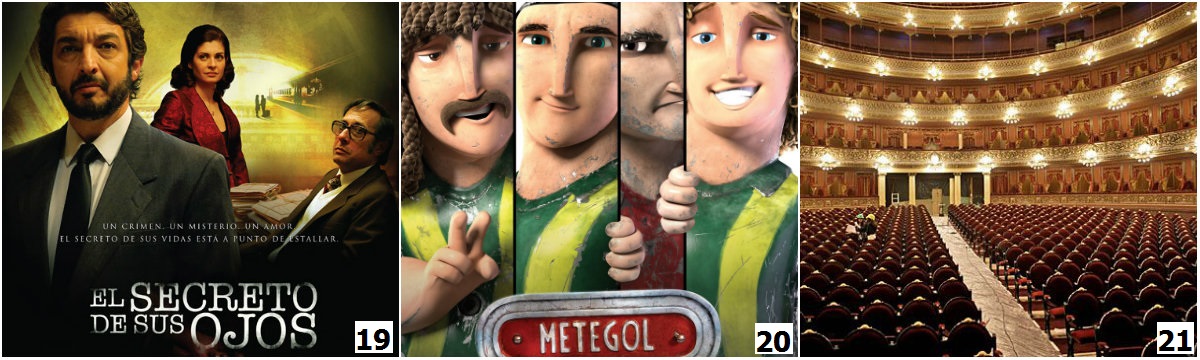 19. El Secreto de sus Ojos, phim giành giải Oscar năm 2009. 20. Metegol, bộ phim hoạt hình thành công sản xuất tại Argentina. 21. Nhà hát Colón.