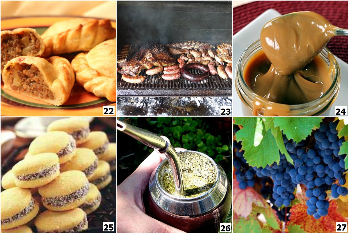 22. Empanadas, bánh gối nhân thịt bò. 23. Thịt nướng. 24. Dulce de leche (mứt sữa). 25. Bánh Alfajores. 26. Trà Mate. 27. Nho Malbec.