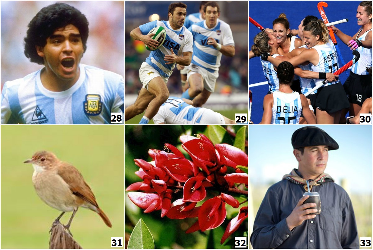 28. Diego Maradona. 29. Pumas, đội bóng bầu dục quốc gia. 30. Las Leonas, đội khúc côn cầu nữ Argentina. 31. Hornero, quốc điểu. 32. Ceibo, quốc hoa. 33. Người kị sĩ Argentina (gaucho).