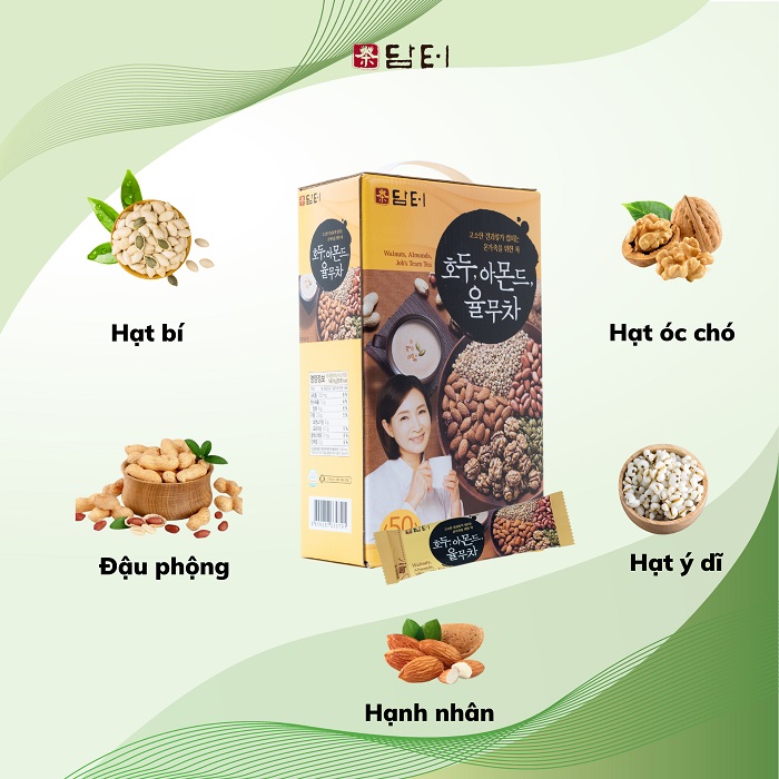 Ngũ cốc hạnh nhân, óc chó, ý dĩ Damtuh Hàn Quốc (hay còn gọi là ngũ cốc cô gái Hàn Quốc) đang là một trong những sản phẩm bột ngũ cốc được đông đảo người tiêu dùng tin tưởng lựa chọn.