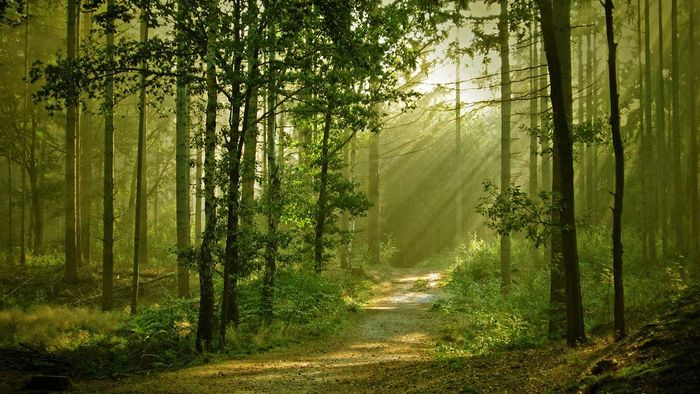 Hình ảnh rừng cây đón nắng, với ánh sáng vàng óng ả xuyên qua tán lá, tạo nên khung cảnh ấm áp và tràn đầy sức sống.