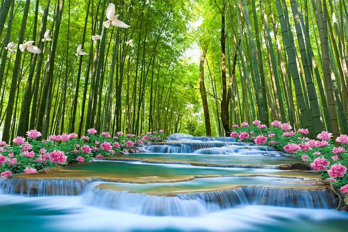 Hình ảnh rừng cây và dòng suối, hòa quyện giữa sự tĩnh lặng của cây xanh và sự sống động của dòng nước.