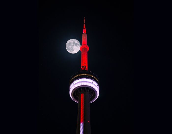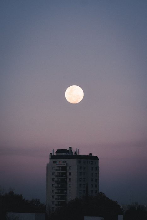 Khoảnh khắc mặt trăng tròn lơ lửng giữa khung cảnh thành phố nhộn nhịp, tạo nên sự tương phản độc đáo