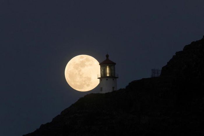 Hình ảnh trăng tròn tỏa sáng trên ngọn hải đăng, tạo nên khung cảnh đầy huyền bí và lãng mạn