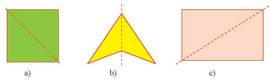 – Hình c) gập đôi hình theo đường nét đứt, ta được hai nửa hình không chồng khít lên nhau nên đường nét đứt không phải là trục đối xứng.
