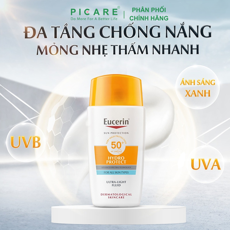 Kem chống nắng cho da nhạy cảm Eucerin Hydro Ultra Light SPF 50+Ưu điểm nổi bật:– Chống nắng đa tầng: Công nghệ Spectral quang phổ rộng giúp bảo vệ da khỏi tia UVA/UVB & ánh sáng xanh- Mỏng nhẹ vượt trội: Thẩm thấu tức thì & mang lại cảm giác tươi mát trên da. Đã chứng minh: 0% nhờn, rít & vệt trắng- Cấp ẩm tức thìĐược chứng minh an toàn cho mọi dấu hiệu nhạy cảm: Khô, đỏ, ngứa, căng da.