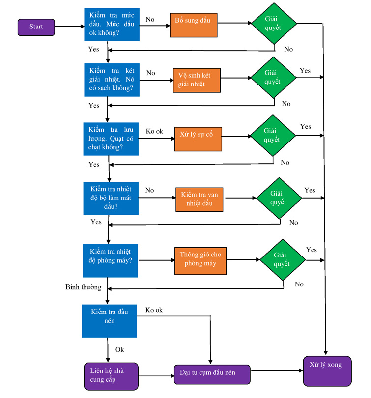 Sơ đồ xử lý sự cố máy nén khí bị nhiệt độ cao