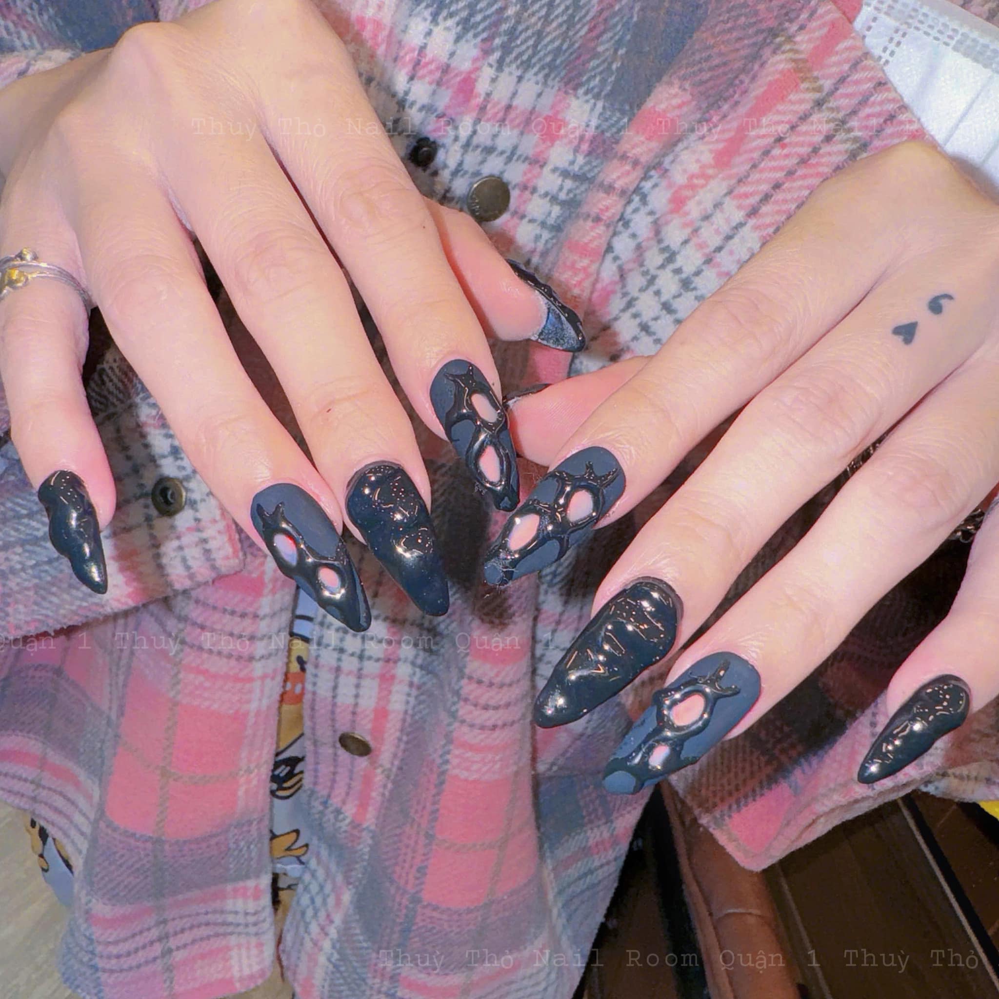 Mẫu nail nhọn tròn màu đen bí ẩn