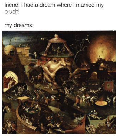 If you page through the examples I gather in my book, you’ll find that I go one step further by not restricting this lens of assembly to memes. I see assembly at work in many other settings. There are thematic counter-maps, satirical Venn diagrams, and social movement hashtags that gather images, feelings, stories, and calls for justice. There are also more subtle versions of distributed assembly that infuse everyday digital communication, as well as events that fuse virtual, distributed assembly with political, in-person assembly, such as the storming of the Capitol on January 6, 2021. I even argue that this cultural form of assembly precedes the internet; we can put the most seemingly banal memetic arrangement alongside certain poignant works of art, such as the triptychs of Hieronymus Bosch, not because they are the same in theme or value, but because both involve putting known elements into expressive arrangements that provoke and move us. Although they work in extremely different ways, they both somehow ask for their constituent parts to be read as expressive constellations, and in the digital context, they are readily available for reappropriation and rearrangement.