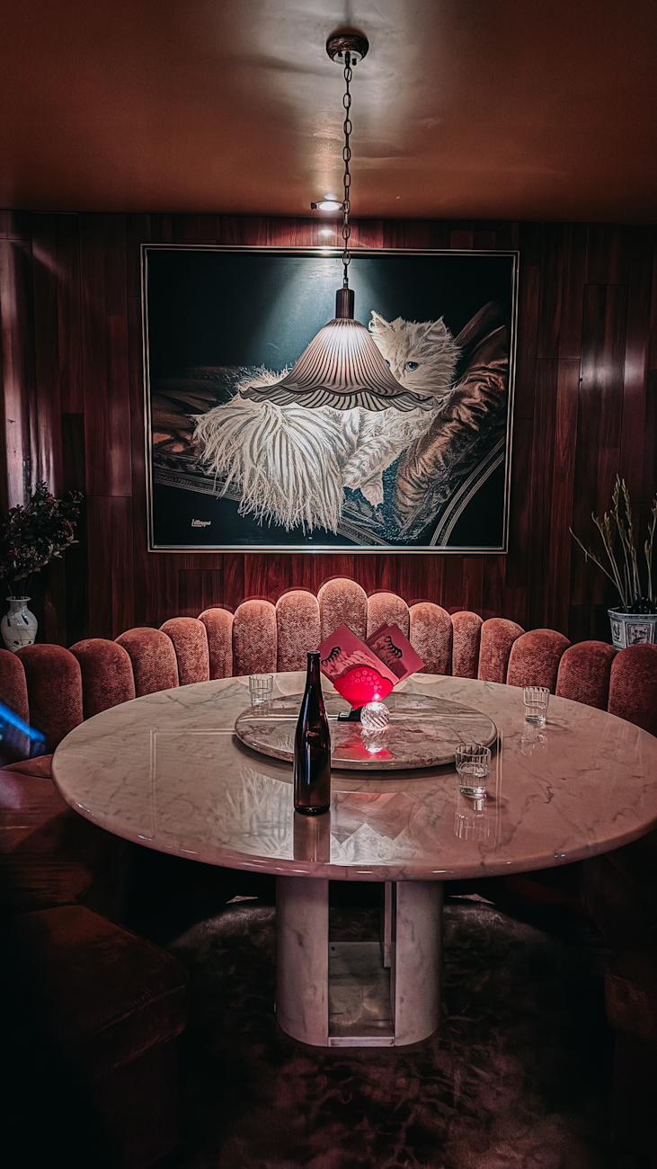 The vibe of Meo is so posh. It has the feel of a speakeasy – intimate, velvety, dim lighting. The colour palette is also quite pink, giving it a feminine and cute look for photos 💖. I also love the cat painting behind us.