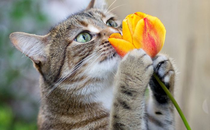 Hình ảnh mèo tặng hoa với sự kết hợp giữa hài hước và đáng yêu, tạo nên những khoảnh khắc khó quên