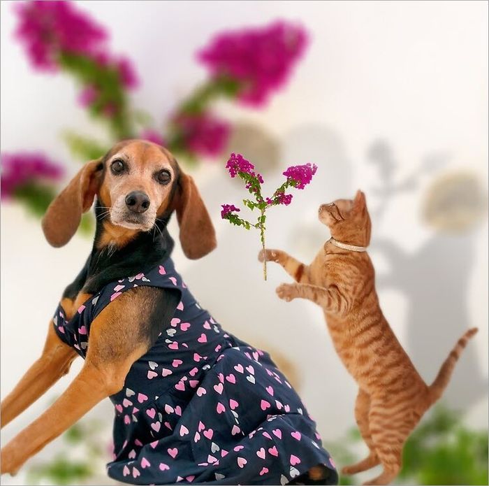 Meme mèo tặng chó bông hoa với tình huống hài hước, tạo nên tiếng cười vui vẻ và bất ngờ