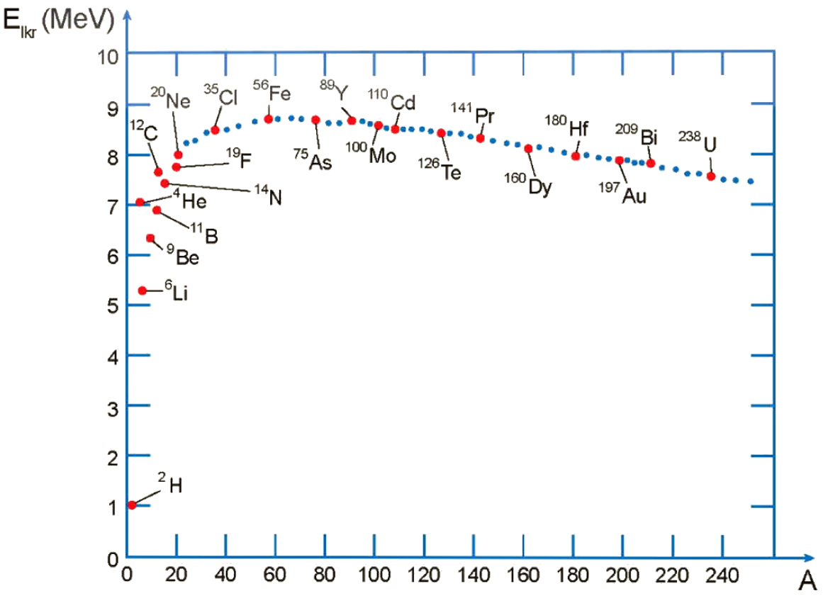 Năng lượng liên kết hạt nhân càng lớn thì liên kết giữa các nuclôn càng mạnh. Tuy nhiên, độ bền vững của hạt nhân không chỉ phụ thuộc vào năng lượng liên kết của nó, mà còn phụ thuộc cả vào tổng số nuclon có trong hạt nhân đó. Do đó, nếu dùng năng lượng liên kết hạt nhân để so sánh sự bền vững thì không hoàn toàn chính xác: một hạt nhân nhiều nuclôn có năng lượng liên kết lớn chưa hẳn đã bền hơn một hạt nhân ít nuclôn có năng lượng liên kết nhỏ hơn. Vì vậy, để so sánh độ bền vững giữa các hạt nhân, cần so sánh năng lượng liên kết trung bình cho một nuclôn, được gọi là năng lượng liên kết riêng. Như vậy, năng lượng liên kết riêng của hạt nhân, kí hiệu là ε, có giá trị bằng thương số giữa năng lượng liên kết và tổng số nuclôn của hạt nhân. Năng lượng liên kết riêng càng lớn thì hạt nhân càng bền vững. Hình bên dưới là đồ thị biểu diễn năng lượng liên kết riêng theo số khối A của hạt nhân.