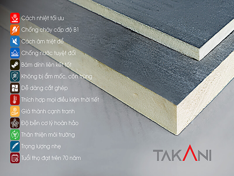 Tấm cách nhiệt Takani được sản xuất trên dây chuyền công nghệ Nhật Bản. Sản phẩm có cấu tạo bởi 3 lớp với 2 lớp ngoài là xi măng polyme đặc chủng và 1 lớp lõi PIR có khả năng cách âm, cách nhiệt, chống nước và chống cháy lan tốt.