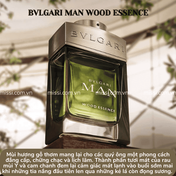 Nổi bật trong 5 chai nước hoa Bvlgari được yêu thích nhất có Bvlgari Man Wood Essence. Mùi hương gỗ thơm mang lại cho các quý ông một phong cách đẳng cấp, chững chạc và lịch lãm. Thành phần tươi mát của rau mùi Ý và cam chanh đem lại cảm giác mát lạnh vào buổi sớm mai khi những tia nắng đầu tiên len qua những kẻ lá còn đọng sương. Gỗ cây bách và cỏ hương bài hòa quyện tạo nên cảm giác ấm áp và dễ chịu kết hợp cùng sự nồng nàn của nhựa cánh kiến trắng, gỗ tuyết tùng và long diên hương. Tất cả tạo ra sự khác biệt của Bvlgari Man Wood Essence.