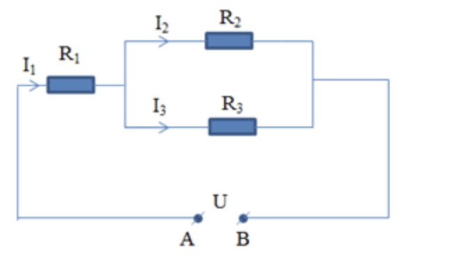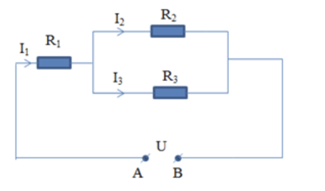 Trong đó có các điện trở R1 = 9Ω , R2 = 15Ω , R3 = 10Ω . Dòng điện đi qua R3 có cường độ là I3= 0,3A. Tính hiệu điện thế U giữa hai đầu đoạn mạch AB.
