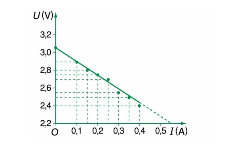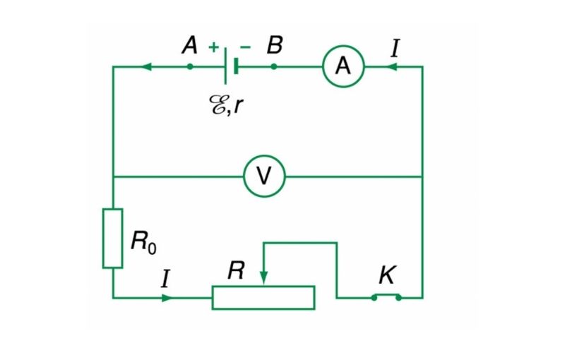 Trong đó, ampe kế (có R rất nhỏ) đo cường độ I của dòng điện chạy trong mạch điện kín, vôn kế (có R rất lớn) đo hiệu điện thế mạch ngoài Un và biến trở cho phép thay đổi điện trở mạch ngoài.