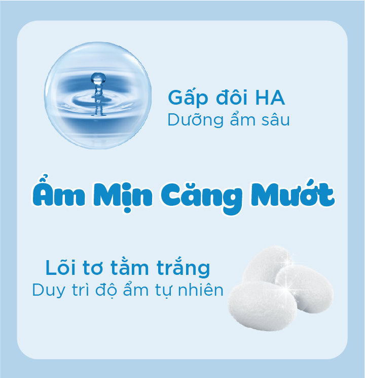 - Chiết xuất từ phức hợp tinh chất tơ tằm thiên nhiên và gấp đôi Hyaluronic acid giúp da ẩm mịn và mềm mượt.