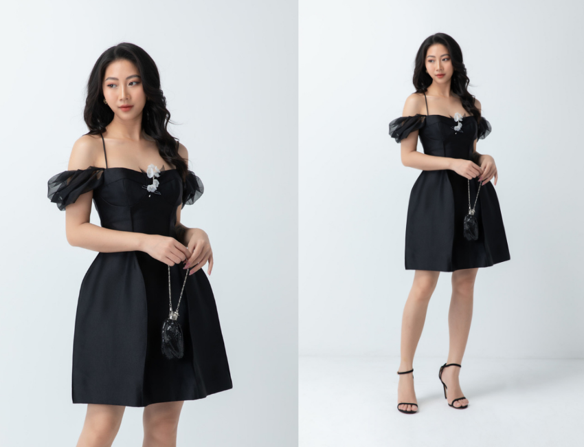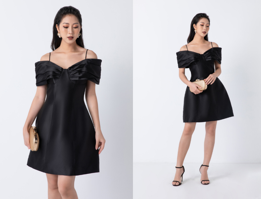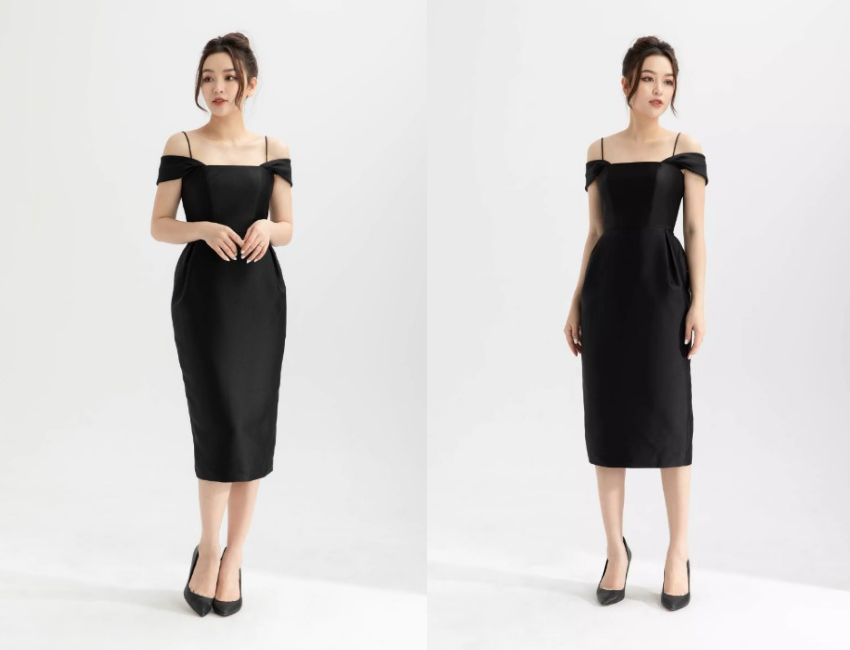 Đầm ôm vai xếp màu đen huyền bí và dễ mặc