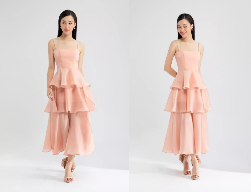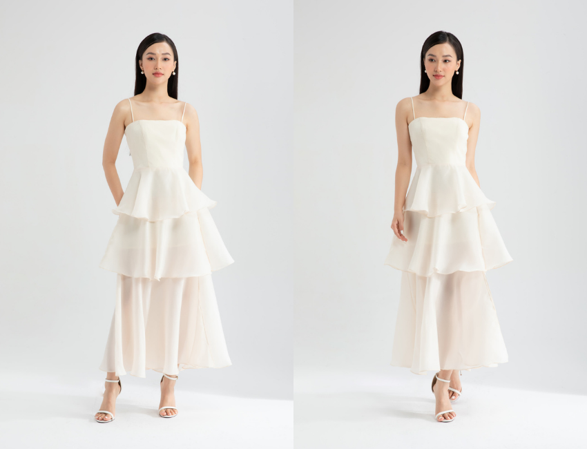 Đầm hai dây xếp tầng cách điệu màu trắng khiến nàng xinh đẹp như công chúa
