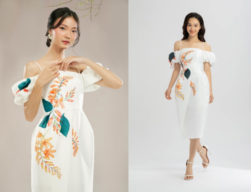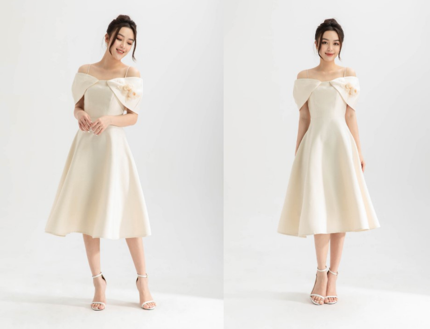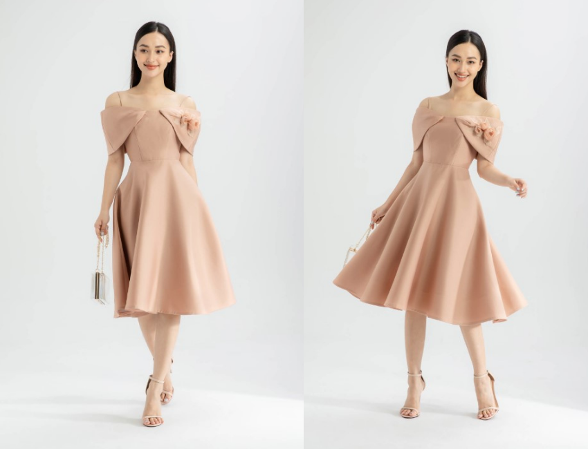 Váy 2 dây dự tiệc trễ vai với thiết kế tay áo bồng, chiết eo đặc biệt với thiết kế xoắn áo trước ngực tạo thành hình bông hoa khá nổi bật và ấn tượng. Phần dưới của váy tạo thành hình sóng mang đến cảm giác thanh lịch và nữ tính.
