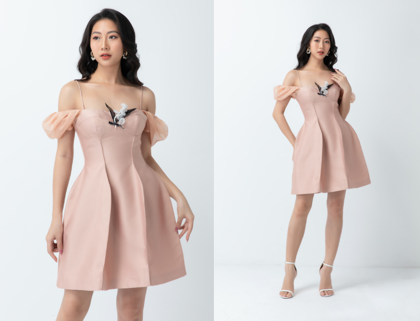 Đầm 2 dây dự tiệc phối lưới ở phần tay áo tạo sự ấn tượng hơn đồng thời với thiết kế đính hoa nổi trước ngực tạo hiệu ứng hướng ánh nhìn của mọi người lên trên cơ thể. Mẫu đầm 2 dây dự tiệc phối lưới dáng ngắn kết hợp cùng giày cao gót khiến nàng trông cao hơn.