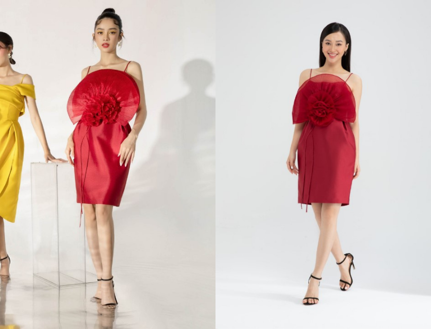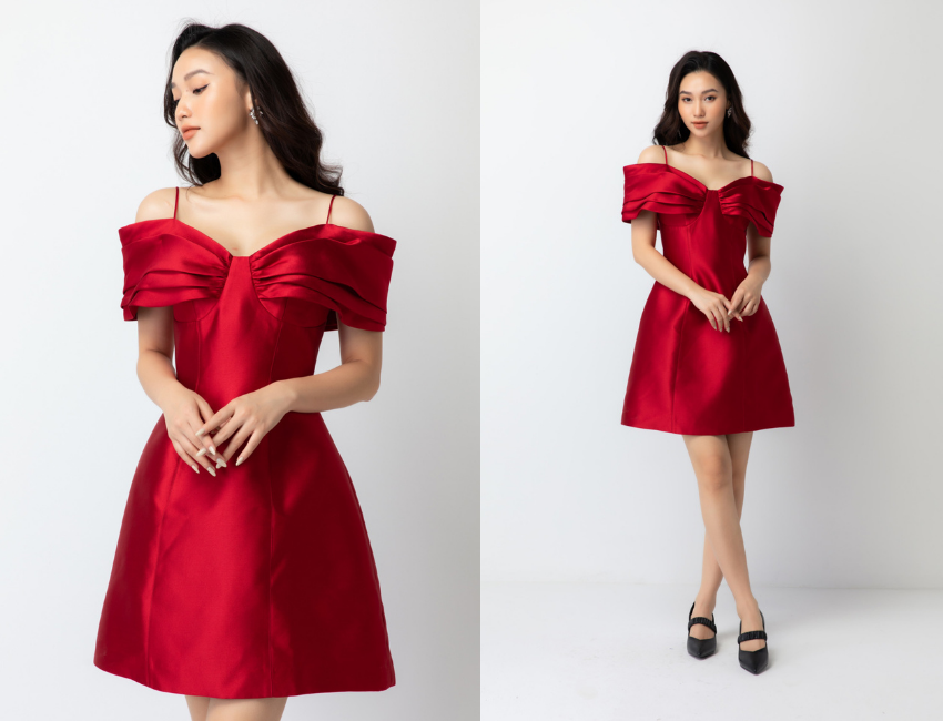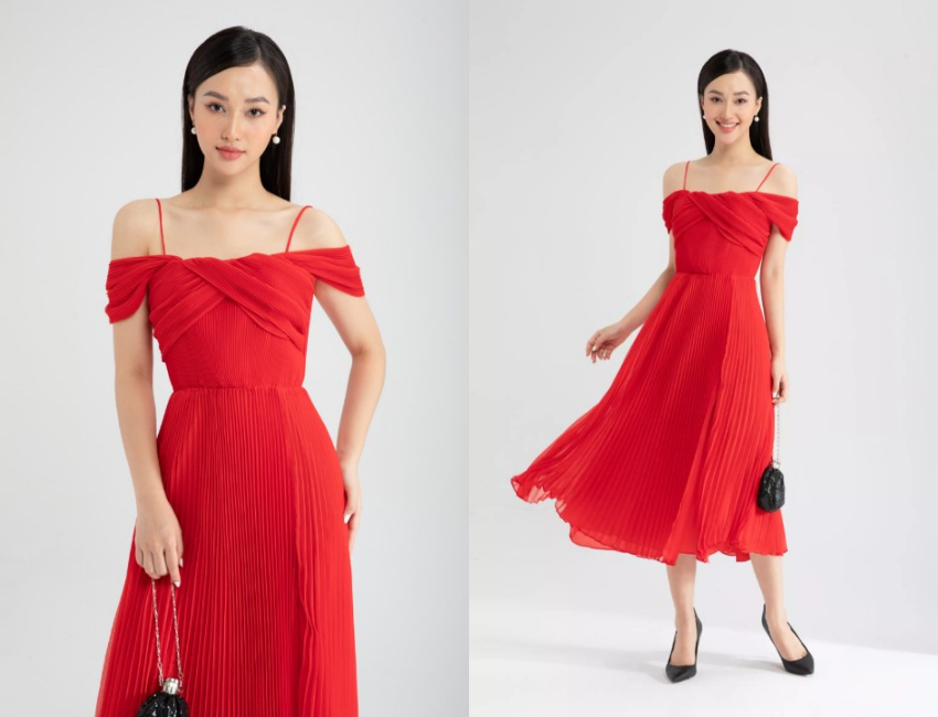 Đầm ôm vai xếp màu đỏ sang trọng và quyến rũ