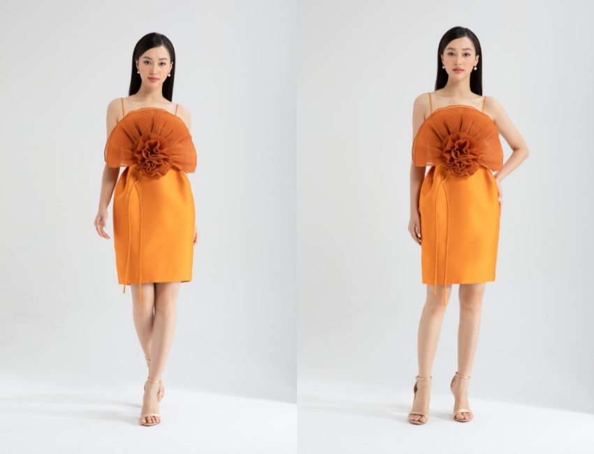 Váy 2 dây dự tiệc xòe hoa là mẫu váy độc đáo với thiết kế hoa trước ngực bản lớn có chút gây choáng ngợp cho người nhìn nhưng cũng là món phụ kiện khiến váy dự tiệc nổi bật hơn trong đêm dạ hội.