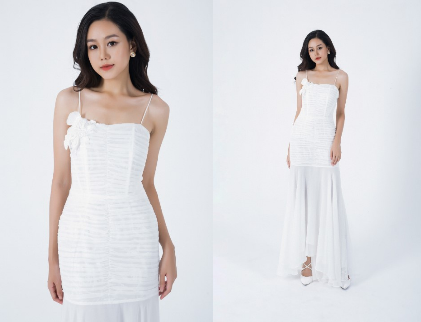 Đầm dạ hội hai dây cách điệu màu trắng tinh khôi