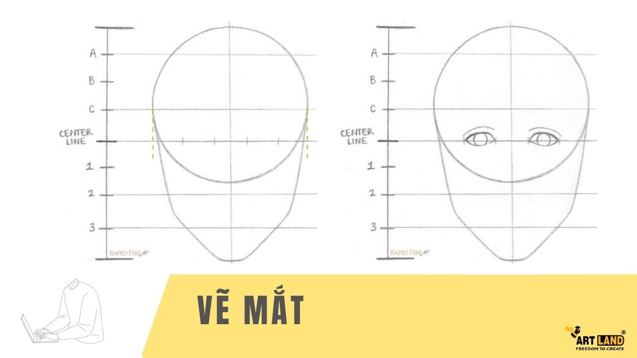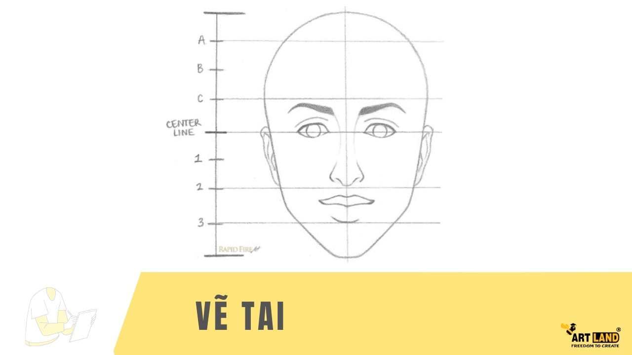 Đánh dấu các đoạn chia thành các tên: A, B, C, 1,2,3 và Center Line. Dùng thước vẽ các đường gióng ngang qua khuôn mặt đã vẽ để làm mốc.