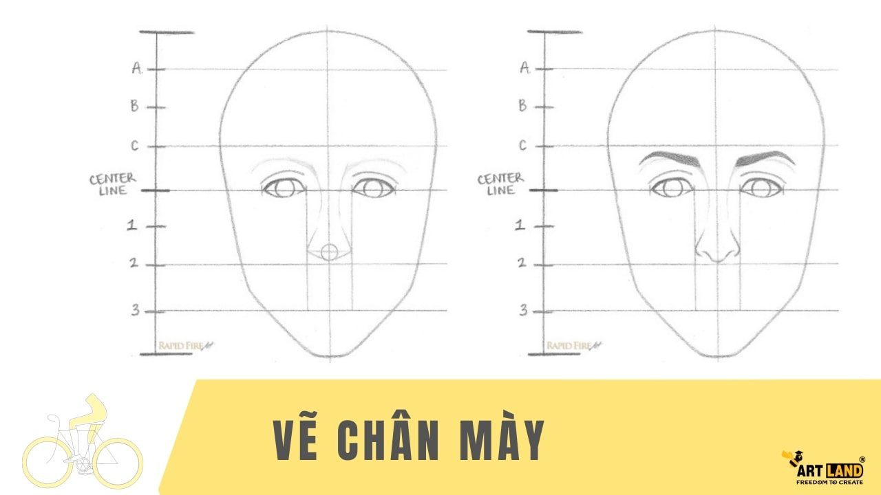 Bức hình sau đây thể hiện cách vẽ chân mày. Chân mày được vẽ bên dưới đường gióng C. Nếu chân mày càng cao thì thể hiện sự ngạc nhiên, nếu chân mày vẽ quá gần nhau thì sẽ có cảm giác dữ. Tùy vào hình ảnh thực tế mong muốn vẽ mà có thể điều chỉnh theo ý thích.