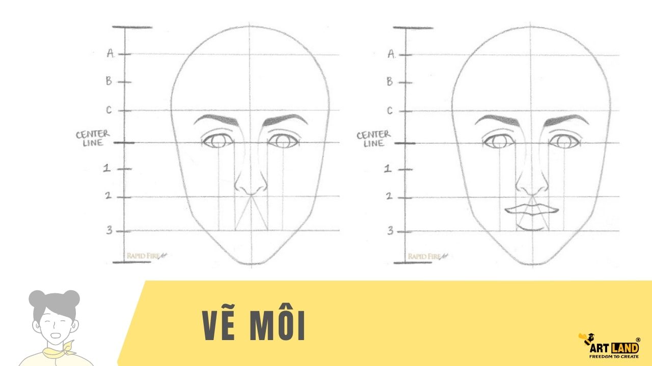 Tiếp tục sử dụng các đường gióng để xác định vị trí của môi. Từ con ngươi, vẽ các đường gióng thẳng đứng để xác định độ rộng của môi.