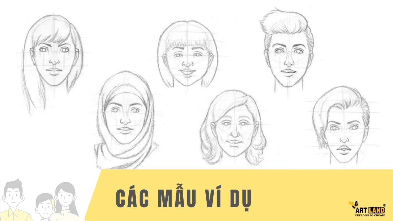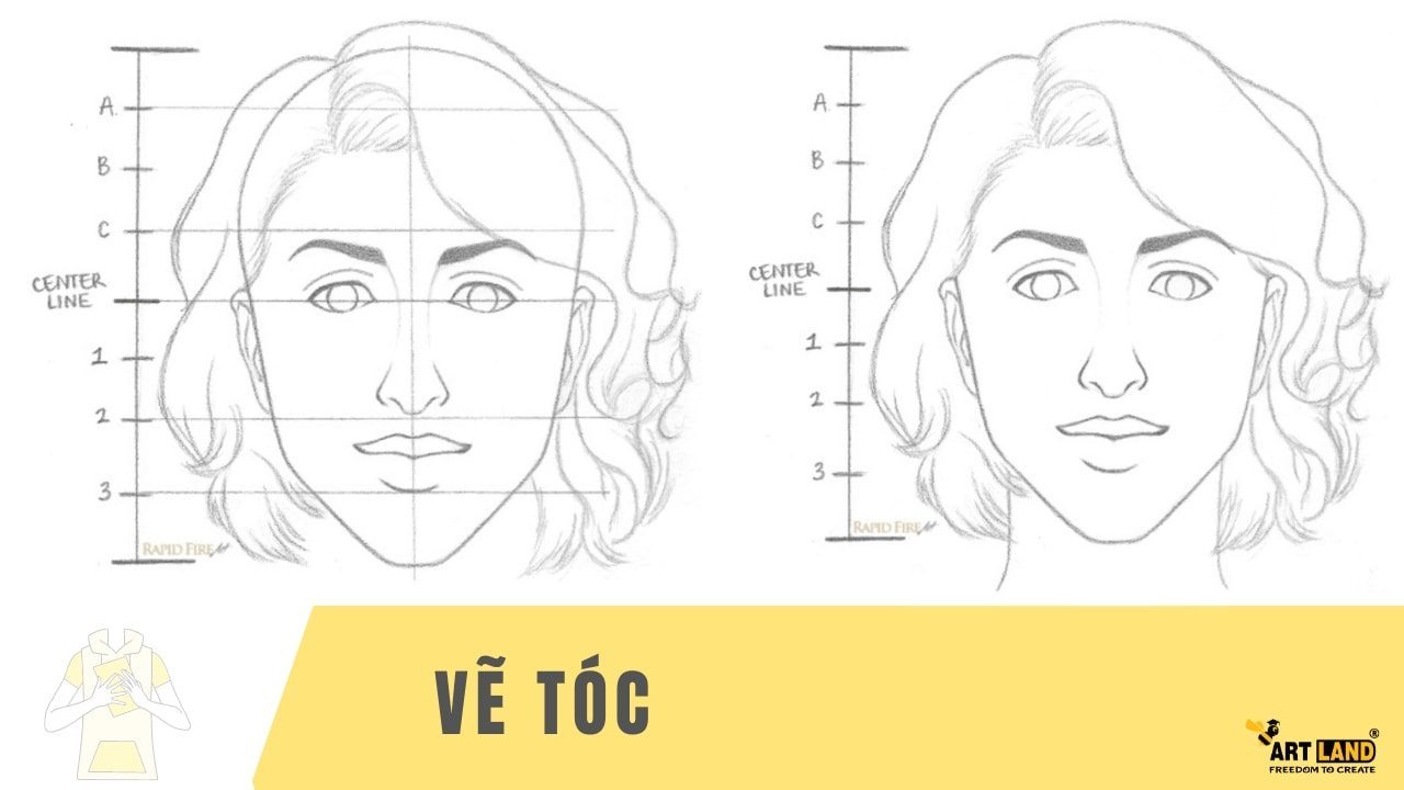Khi vẽ tóc cho nữ, hãy nhớ rằng: nữ giới có vần trán ngắn và nhỏ hơn nam giới. Vẽ đường chân tóc ngay bên dưới đường gióng A và vẽ thêm đường tóc cho hai bên trán. Hãy nhó đừng vẽ chân tóc quá gần với chân mày.