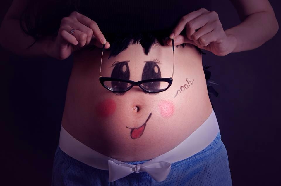 Người đẹp tinh nghịch với hình vẽ bụng bầu đáng yêu, tên người yêu được viết bên cạnh gương mặt hài hước.