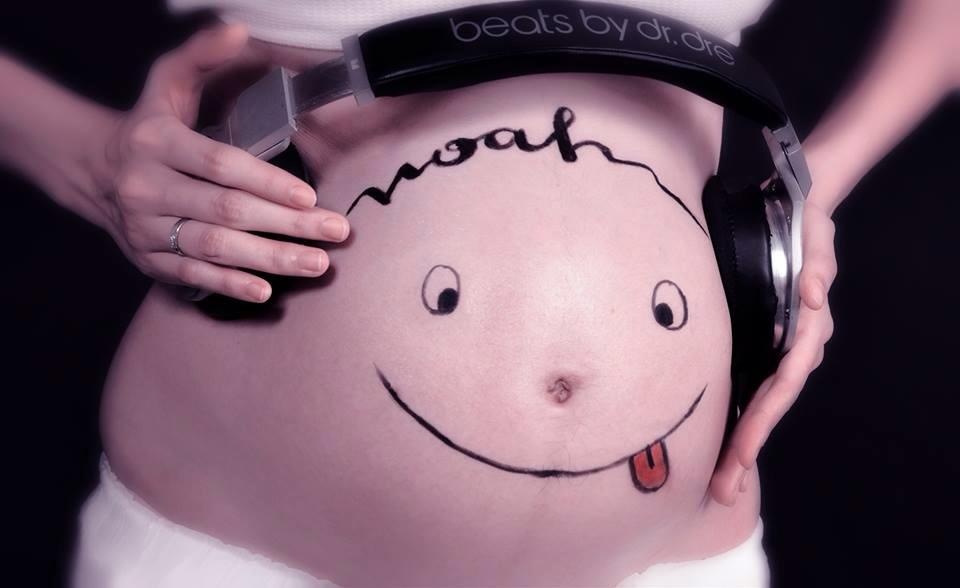 Kèm theo lời chia sẻ cảm động, Hoa hậu thế giới người Việt 2010 đăng tải những hình ảnh ngộ nghĩnh, được tô vẽ mặt người cùng những biểu cảm đáng yêu trên bụng bầu 8 tháng.